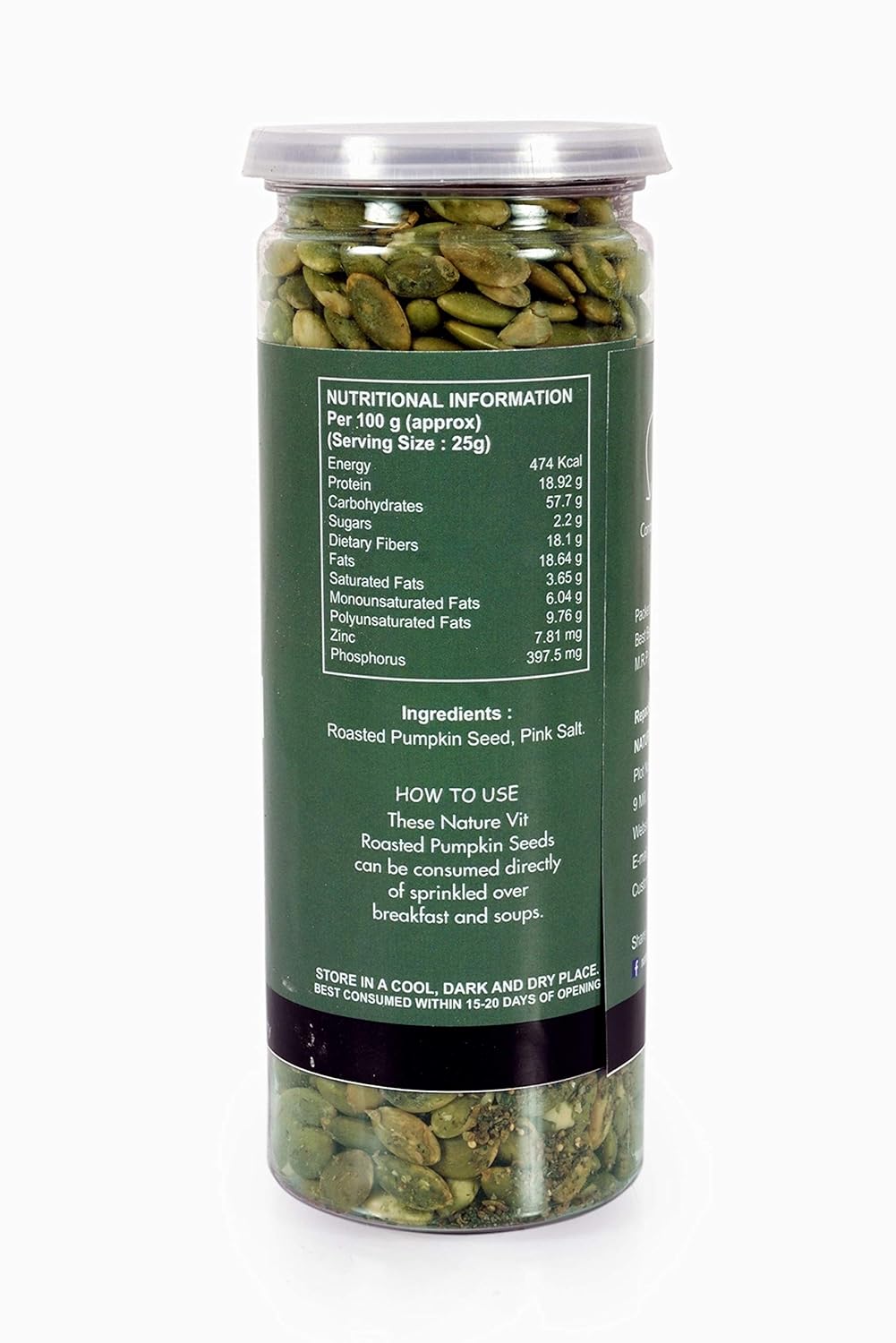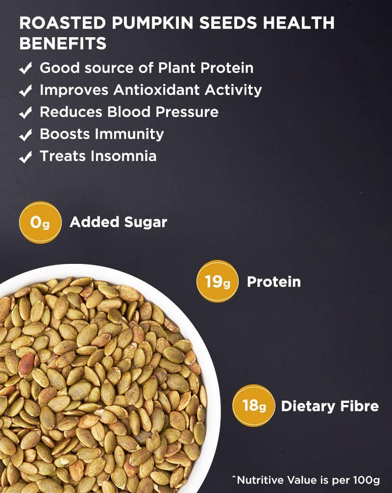 NatureVit Roasted Pumpkin Seeds  are a powerhouse of nutrition and taste. Lightly salted and perfectly roasted to retain their crunch and flavor, these seeds are an ideal snack for health-conscious individuals. Rich in protein, healthy fats, fiber, magnesium, and zinc, they support immunity, heart health, and weight management. Great for snacking, salad toppings, smoothie bowls, and baking.